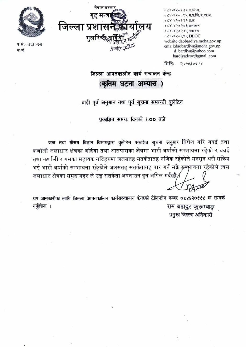 | (कृत्रिम घटना अभ्यास) बाढी पूर्व अनुमात तथा पूर्व सूचना सम्वन्धि बुलेटिन |